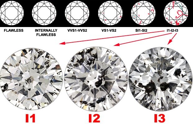 Всего существует 6 диапазонов чистоты, когда речь заходит о бриллиантах, GIA и градации. Это: FL, IF, VVS, VS, SI и I. Самый низкий диапазон - это диапазон чистоты I (самый высокий - безупречный). Этот диапазон на самом деле разбит на 3 различных класса: