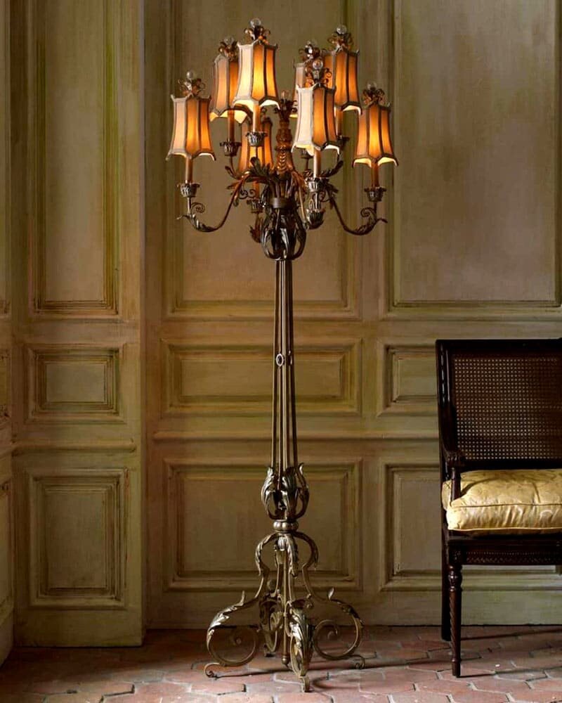 Освещение играет важную роль в восприятии интерьера. С его помощью в комнате можно создать особое настроение. Отличным выбором для ценителей эксклюзивных вещей станет кованый торшер. Торшер - это напольный осветительный прибор на высокой подставке. Его конструкция обычно включает абажур, но есть модели и без него. Наличие абажура обеспечивает мягкий, рассеянный свет, который абсолютно не утомляет глаза и создает в помещении уютную атмосферу. Абажур может быть изготовлен из пластика, стекла, текстиля или так же, как и подставка, из металла. Виды торшеров Торшеры делятся на два основных вида. Первые предназначены для размещения внутри помещения, а вторые - на улице. Для домашних светильников степень защиты должна составлять IP20, а для уличных – от IP44 и выше. Основание торшера обычно имеет достаточно большой вес, который делает его устойчивее. Особенно важно это для светильников с массивными плафонами. Свет торшера может быть направленным или рассеянным. Первый вид освещения является