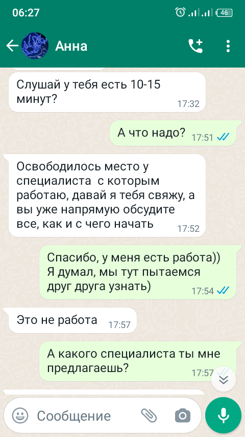 Здравствуйте, дорогие подписчики. Недавно попробовал пообщаться с ещё одной особой. Если вы думаете, что предыдущий случай был странным, то ошибётесь. То, что я встретил дальше, не идёт ни в какое сравнение. Начиналось все вполне стандартно. Чем увлекаешься, чем занимаешься и и тому прочее. А вот потом началось что-то странное: Мне уже предлагают какого-то специалиста. Психолога? Коуча? Консультанта? Нет, все одновременно банальнее и страннее, чем может показаться: Ага, то есть какая-то схема покупки чего-то непонятного (на свои деньги, небось) и продажи дороже, чем покупал. Ну, во-первых, мне кажется про такую вещь уже птицы знают, во-вторых, это уже не форекс. Это уже леомакс какой-то получается: покупаем совершенно ненужную вещь и продаем втридорога тому, кому она нужна ещё меньше. Я уже отказался, но мне, тем не менее, с упорством, достойным лучшего применения продолжают "впаривать" подобный заработок. Спросите зачем? Смотрите и удивляйтесь: Тут я уже перешёл в контратаку и предлож