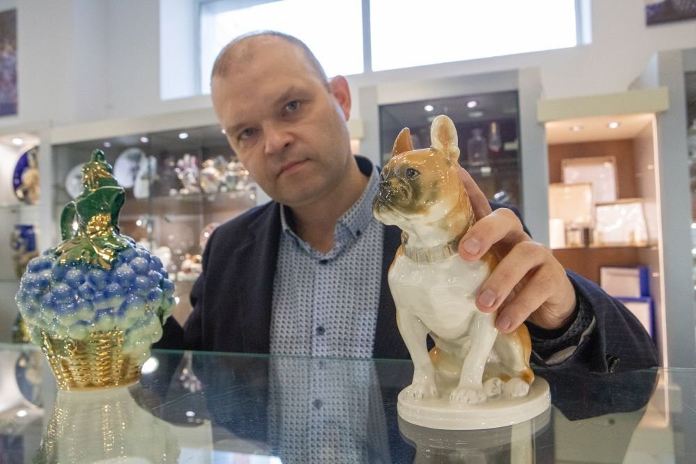 С Александром Сергеевичем Кочиным, руководителем цеха костяного фарфора, мы познакомились в магазине предприятия. Потомственный фарфорист присматривался к большой статуэтке "Бульдог", которую предприятие выпускает уже лет семьдесят.