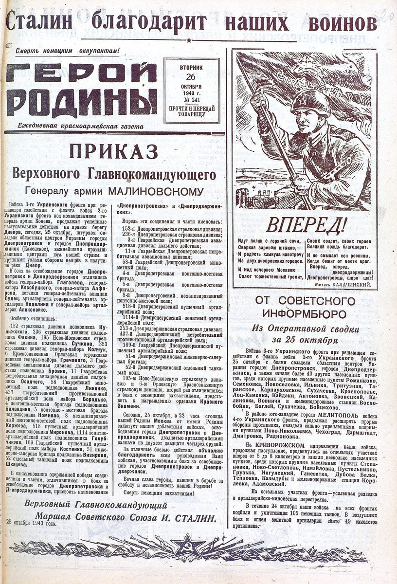 23 октября 1943 года Красная Армия приступила к одному из последних этапов битвы за Днепр - Днепропетровской операции. В соответствии с ее замыслом, войска 3-го Украинского фронта форсировали Днепр южнее и западнее Днепропетровска, а затем в ходе стремительного ночного штурма освободили город. В честь этой блистательной победы 10 соединений и частей, отличившихся в боях, получили почетное наименование "Днепропетровских".