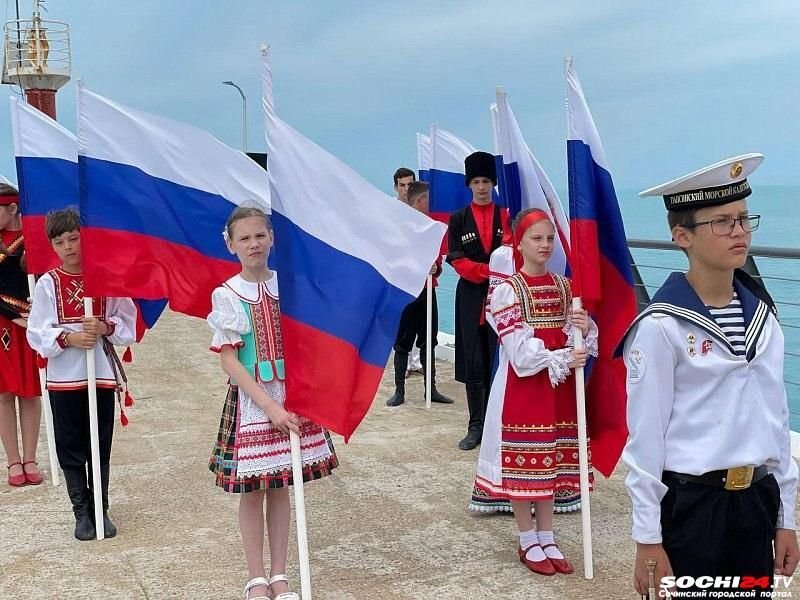 В 17.00 молодежь города выстроится на берегу моря у морского порта в контур карты России и запустит в воздух сухие краски белого, синего и красного цветов, изобразив флаг России.