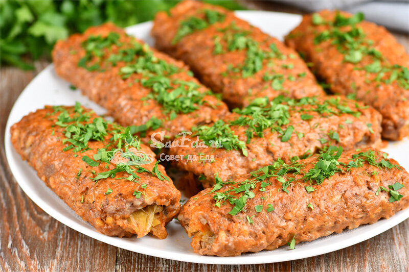 12. Вот так они выглядят в разрезе. Жареная капуста при запекании пропитывается соком от мяса и дает отличный вкус блюду. Фарш не пересыхает, так как покрыт соусом. Это сочное и очень вкусное блюдо. Для меня оно вкуснее, чем классические голубцы.