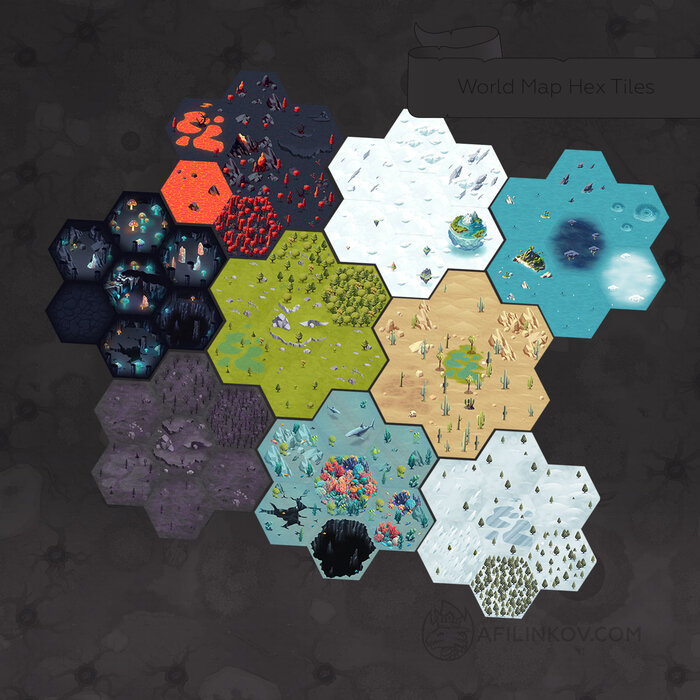 Недавно подписчик-ГМ попросил меня сделать приятные глазу гексы для генерируемой карты, а поскольку я уже начинал делать генератор карт, я счел полезным сделать подобные тайлы, ну и заодно наделать текстур для будущего генератора. Короче, чтобы упростить себе процесс, я его слегка усложнил, так сказать: D Ну и из-за возникшего ответвления в процессе сделал вот такие штуки. Знаю, что есть генераторы, тьма их, но как-то результат не всегда выглядит хорошо на мой взгляд. Вкусовщина, не спорю, но делал так, чтобы самому было приятно играть. На изобретение велосипеда не претендую, если что :) Получившиеся тайлы и карта, которая соберется в итоге, очень хорошо совмещаются с иконками для карт, которые я делал ранее! Стиль, все дела. Немного о гексах: Девять биомов/типов карты, включая подводные, воздушные и подземные. Каждый биом состоит из 8 гексов. А также почти для каждого биома есть цепочка гор и одна здоровенная гора. Есть гексы с “туманом войны” для зачистки карты (hexcrawl) Есть гексы