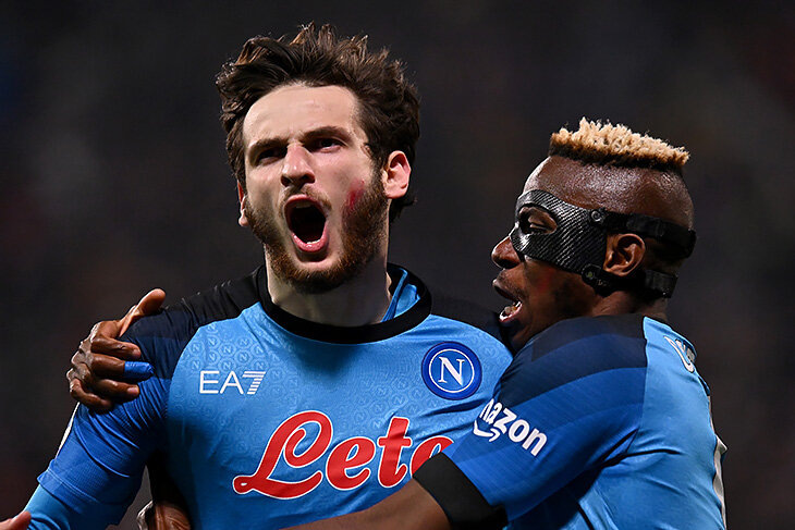 Осимхен тоже хорош. «Наполи» продолжает спокойный поход к чемпионству в Серии А. Новая жертва – «Сассуоло». Главный хайлайт – гол Хвичи. Сделал все сам, подхватив мяч в центре поля Уверенная победа в гостях (2:0) началась с гола Хвичи после яркого сольного прохода. На 12-й минуте Кварацхелия подхватил мяч в центральном круге, ушел от подката, долетел до штрафной в окружении четырех защитников и выждал момент для удара. Закатил несильно, но точно в угол – и перехитрил Консильи. У Хвичи впечатляющая результативная серия – забивает в трех турах Серии А подряд. Подобное с Кварацхелией случилось во второй раз в карьере – в мае прошлого года он за 3 игры забил 4 гола за «Динамо» из Батуми. Теперь Хвича пробил отметку в 10 голов в чемпионате Италии. Прямо сейчас он идет на четвертом месте в гонке бомбардиров Серии А – забил больше Дибалы, Влаховича, Рафаэла Леау, Иммобиле. Выше только Лаутаро Мартинес и Адемола Лукман (по 12 голов) и Виктор Осимхен (18). По гол+пас Кварацхелия и вовсе второй