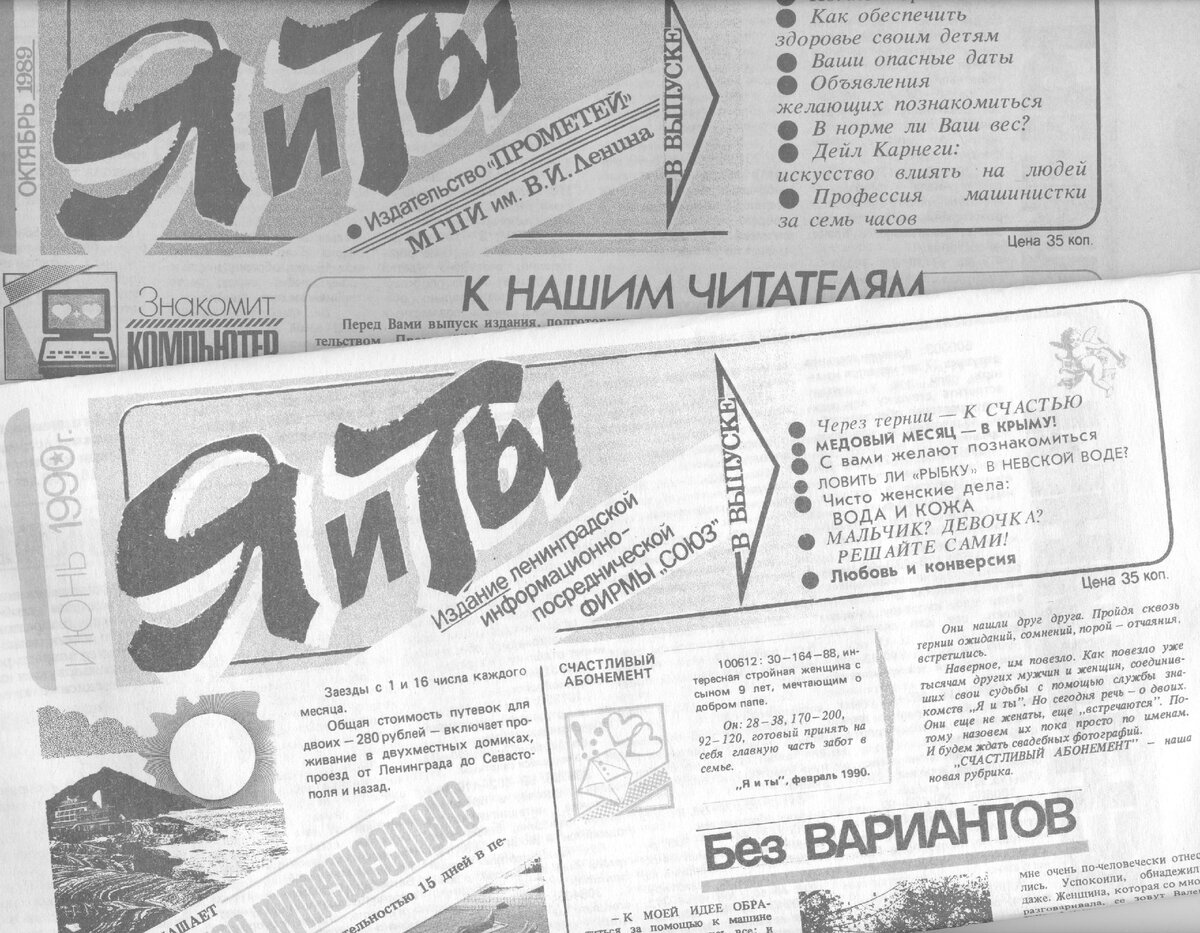 Называлась газета «Я и Ты», а хоронилась она под эгидой организации с довольно витиеватым, но характерным для тех времен названием: «Информационно-посредническая фирма кооператив “Союз”». Когда, много лет спустя, я оформлял пенсию, запись эту в Пенсионном фонде сочли несущественной и в мой трудовой стаж не включили.