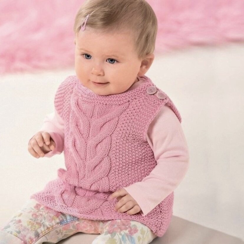 Довольно длинный жилет с удобной застежкой на плече и эффектными узорами можно связать и мальчику, и девочке, нужно лишь подобрать правильный цвет. Размер 62/68 (74/80) 86/92 Вам потребуется Пряжа (100% шерсти суперфайн; 105 м/50 г) — 200 (250) 300 г розовой; спицы №4 и 4,5, круговые спицы №4; 2 светло-серые пуговицы. Узоры и схемы Платочная вязка Лицевые и изнаночные ряды вязать лицевыми. Жемчужный узор Попеременно 1 лицевая, 1 изнаночная. В каждом ряду узор смещать на 1 петлю. Узор «Коса» Вязать по схеме. На ней даны только лицевые ряды. В изнаночных рядах все петли вязать по рисунку. 1–12-й р. постоянно повторять. Плотность вязания 19 п. х 34 р. = 10 x 10 см, связано жемчужным узором. Спинка На спицы №4 набрать 52 (60) 66 петель и вязать 5 р. платочной вязкой. Затем перейти на спицы №4,5 и вязать, распределяя петли следующим образом: кром., 4 п. платочной вязкой, 42 (50) 56 п. жемчужным узором, 4 п. платочной вязкой, кром. Через 17 (20) 23 см от начального ряда закрыть с обеих сто