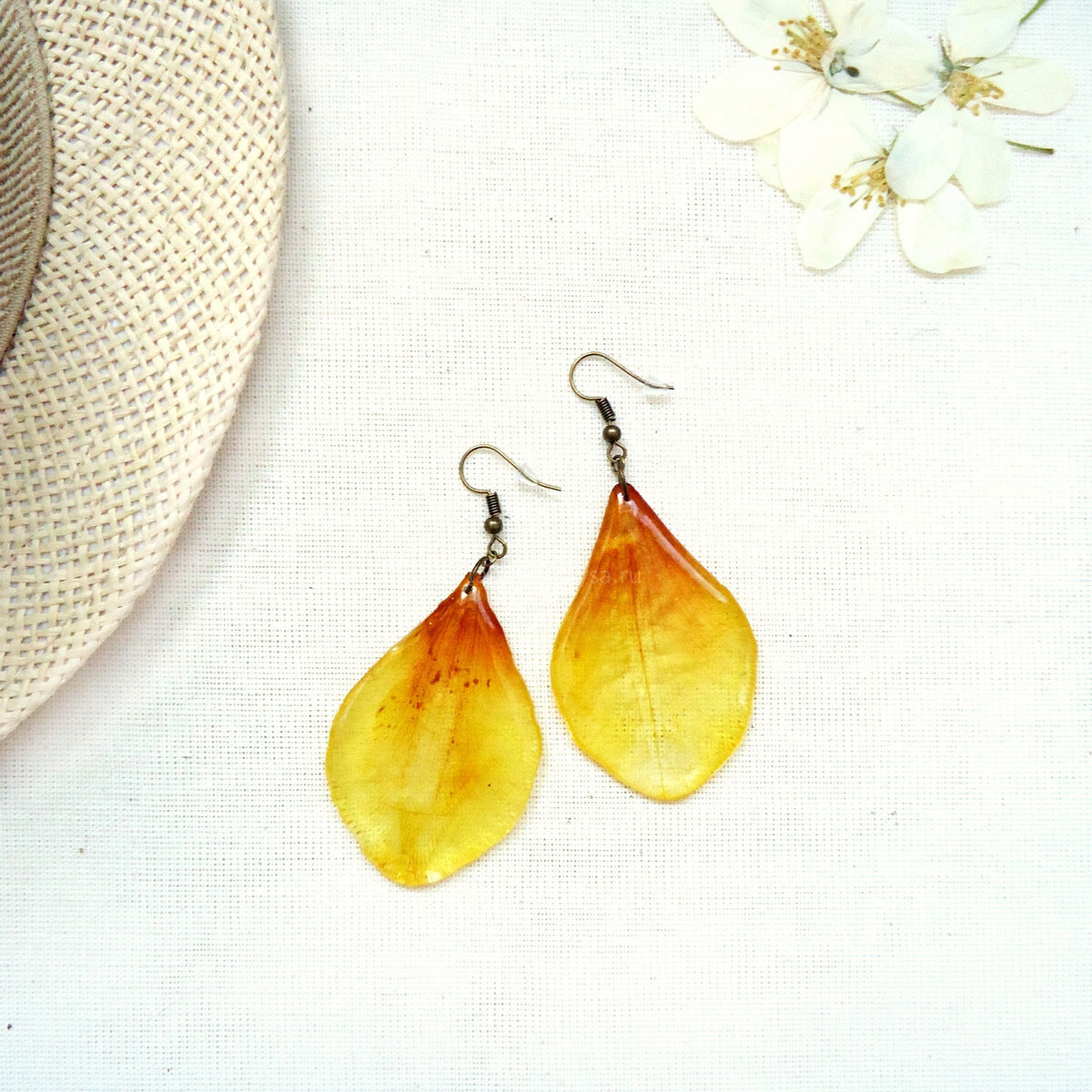 с использованием эпоксидной смолы и творческой фантазии." Авторские серьги ручной работы, выполнены с использованием засушенных вручную лепестков желтого тюльпана, залитых ювелирной эпоксидной смолой.