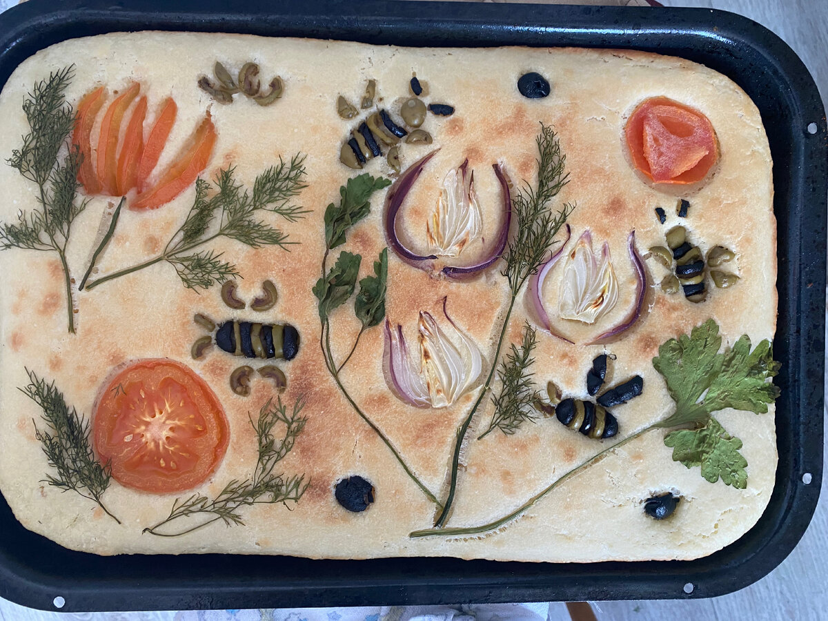 Чтобы приготовить фокаччу нужен минимум продуктов:мука, дрожжи, вода, ложка сахара и две ложки масла. В приготовлении очень просто, а получается очень вкусная фокачча с хрустящей корочкой и миллионом пузырьков! Попробуйте, равнодушными точно не останетесь! Мои домашние ее любят больше, чем хлеб Ингредиенты: мука 500 грамм дрожжи сухие 3-4 грамма вода 400 мл (я добавляю 500 мл, тесто получается очень жидким) оливковое масло 2 ст.ложки сахар 1 ч.ложка соль 10-15 грамм Смешиваем муку, дрожжи, сахар и 300 мл воды. Мешаем ложкой. Доливаем воду и 10-15 гр соли. Мешаем. Добавляем оливкой масло и снова очень хорошо мешаем ложкой. Накрываем пищевой пленкой на 20-30 минут. Открываем и мешаем ложкой снизу на себя Накрываем пленкой и оставляем на час. Смазываем руки маслом, и хорошо мешаем наше тесто снизу на себя. Смазываем подсолнечным маслом противень и выкладываем тесто. Оставляем на 30-40 минут. Очень аккуратно прижимаем пальцами. При желании украшаем. Отправляем в разогретую