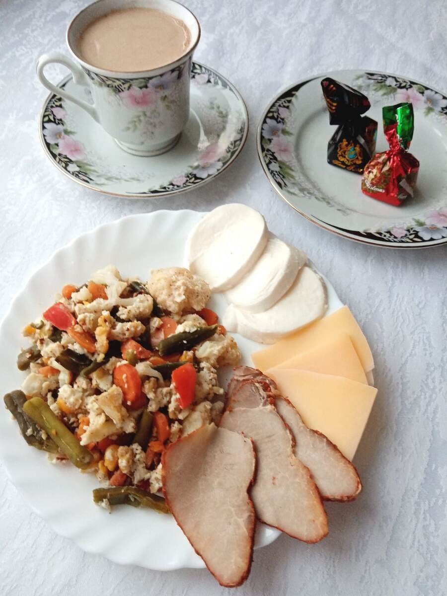 Приветствую всех заглянувших! Утро субботы у нас тоже начинается рано. Хотя и не так рано, как в будние дни, но все же. Суббота у нас учебный день. Так вставать не хотелось, прям какая-то слабость была. Неделя очень выдалась насыщенной. На завтрак сделала скрамбл с оставшимися тушеными овощами. А по-русски омлетом овощи залила и перемешала🤭. Мы такое любим. А кто не любит, тому просто отварные яйца. Плюс запечённое мясо, сыр моцарелла и пара кусочков сыра чеддер. Ну, и конфетки к чаю. Детям в школу фруктовая нарезка, сыр и бутерброды - стандартный набор. Мяса осталось ещё много, сразу большой кусок замариновала. Убрала в морозилку, предварительно нарезав, пойдёт потом в пиццу на 23 февраля. На крайний случай в солянку сборную мясную. Но, все же пиццу планирую! По делам пришлось поездить, в МФЦ целый час просидели. Заодно и в Да! заскочила. Надо сказать, удачно! Но, покупки все покажу отдельной статьёй, чтоб не путаться. К обеду сварила суп с фрикадельками. Этот суп у домочадце