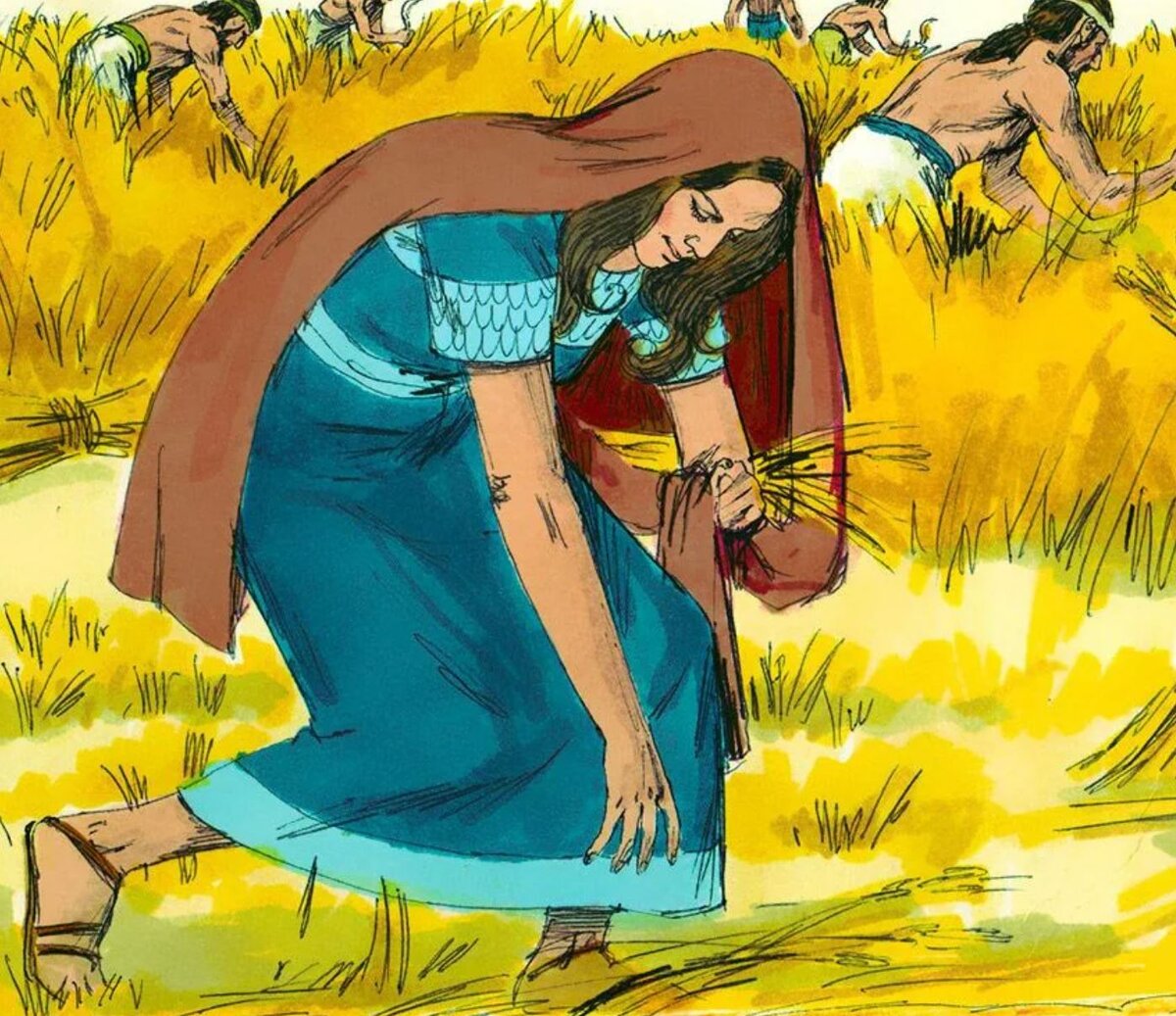 Женщины продолжили свой путь, пока не добрались до Вифлеема. Жители очень удивились, когда увидели Ноеминь спустя столько лет, но она попросила всех называть её Мара. Это имя означает "горькое". Она выбрала его, потому что после смерти мужи сыновей её жизнь стала горькой. Ноеминь и Руфь стали думать как обеспечить себя едой. В Израиле был закон, позволявший ходить бедным людям за жнецами и подбирать за ними упавшие колосья. Жнецы - это люди, занимавшиеся сбором урожая. Рано утром Руфь пошла на ячменное поле и стала собирать колосья. Это очень нелёгкий труд. Но Руфь так старательно трудилась, что на неё обратил внимание хозяин поля по имени Вооз. Он спросил у своих слуг, кто эта женщина. Они рассказали ему, что Руфь пришла из дальних земель, чтобы заботиться о своей свекрови.