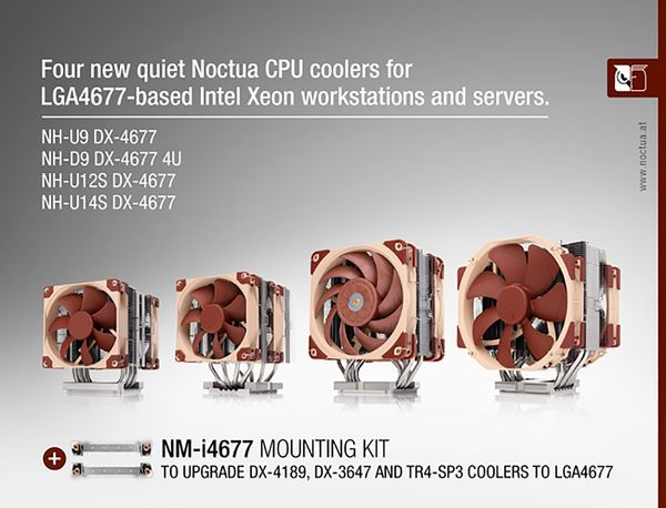 Незадолго до презентации процессоров Xeon W-2400 и W-3400, детальнее про которые буквально в соседней новостной заметке, австрийская компания Noctua представила первые совместимые системы охлаждения. В линейку кулеров для платформы LGA4677 вошли уже хорошо знакомые энтузиастам модели: NH-U14S DX-4677, NH-U12S DX-4677, NH-U9 DX-4677 и NH-D9 DX-4677 4U. Они подходят для использования как в рабочих станциях, так и серверах U-формата.