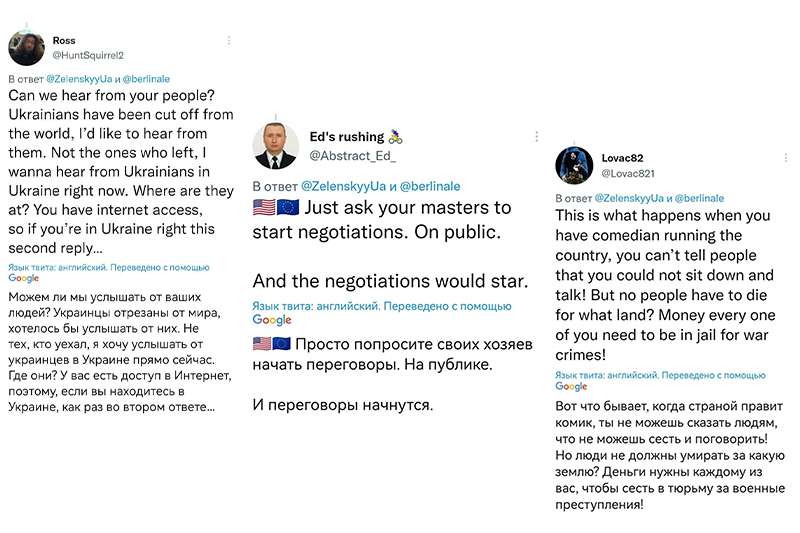 Владимир Зеленский в социальных сетях в очередной раз обвинил Россию в агрессии по отношению к Украине и ее жителям. Пользователи в комментариях под публикацией задались вопросом, почему граждане Украины «отрезаны от мира» и требуют от президента дать свободу слова. «Можем ли мы услышать от ваших людей? Украинцы отрезаны от мира, хотелось бы услышать от них. Не тех, кто уехал, я хочу услышать от украинцев в Украине прямо сейчас. Где они? У вас есть доступ в Интернет, поэтому, если вы находитесь в Украине, ответьте прямо сейчас», - пишет один из пользователей. Некоторые в комментариях объяснили происходящее на Украине тем, что страной «правит комик», которому важнее деньги, а не люди. Также европейцы требуют Зеленского попросить его «хозяев» начать переговоры. «Вот что бывает, когда страной правит комик, ты не можешь сказать людям, что не можешь сесть и поговорить! Но люди не должны умирать, за какую землю? Деньги нужны каждому из вас, чтобы сесть в тюрьму за военные преступления», «Про
