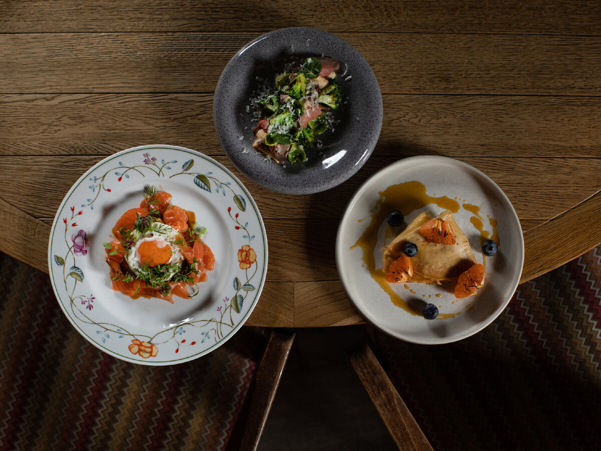 Во FLØR можно будет заказать 3 позиции: шпинатные зеленые блины с красной икрой (650 руб.), блины с жульеном из белых грибов и шампиньонов, со страчателлой и черным трюфелем (750 руб.) и блинный торт со сметанным кремом, соусом из черники и брусники с добавляем эстрагона, свежей голубикой и горьким шоколадом (450 руб.). На завтрак (до 14:00 ежедневно) доступны к заказу блины с лососем, яйцом пашот и голландским соусом (650 руб.) и датский блин (550 руб.), запеченный в духовке с пеканом, голубикой и крем фрешем.