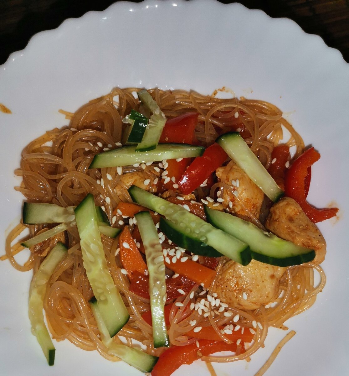 Ингредиенты: Способ приготовления: Пожарить филе курочки, посолить, добавить сушеный чеснок и любые приправки. Пока обжаривается курочка, необходимо запарить фунчозу (по инструкции на упаковке). Порезать морковь и сладкий перчик брусочками, добавить к обжаренному филе. Необходимо, чтобы овощи именно пожарились, а не тушились. После того, как овощи пожарятся, а лапша запарится, соединяем все ингредиенты и добавляем соевый соус и свежий огурчик. Перемешиваем и готово. Приятного аппетита)!