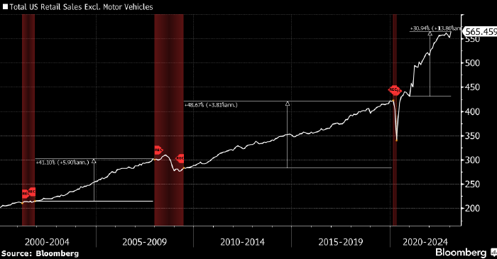 В текущем экономическом цикле, который начался после пандемии Covid-19, розничные продажи в США растут в три раза быстрее, чем в двух предыдущих циклах. Это — очевидный проинфляционный фактор, который может вынудить ФРС занимать жесткую позицию дольше, чем ожидается, и спровоцировать новую волну снижения рискованных активов. Индекс розничных продаж в США (за исключением продаж автомобилей и запчастей) в млрд $. Источник: Bloomberg 15 февраля мы узнали о том, что розничные продажи в США в январе неожиданно подскочили на 3% м/м, что стало рекордным ростом с марта 2021 г. Показатель заметно превысил консенсус-прогноз на уровне +1,8% м/м и показатель декабря на уровне -1,1% м/м. По данным Bloomberg, в этом экономическом цикле, который начался после коронавирусного кризиса, розничные продажи в США растут в три раза быстрее, чем в двух предыдущих циклах. Во-первых, это отражает высокую инфляцию, т. к. розничные продажи считаются в номинальном выражении, т. е. без поправки на инфляцию. Но, во