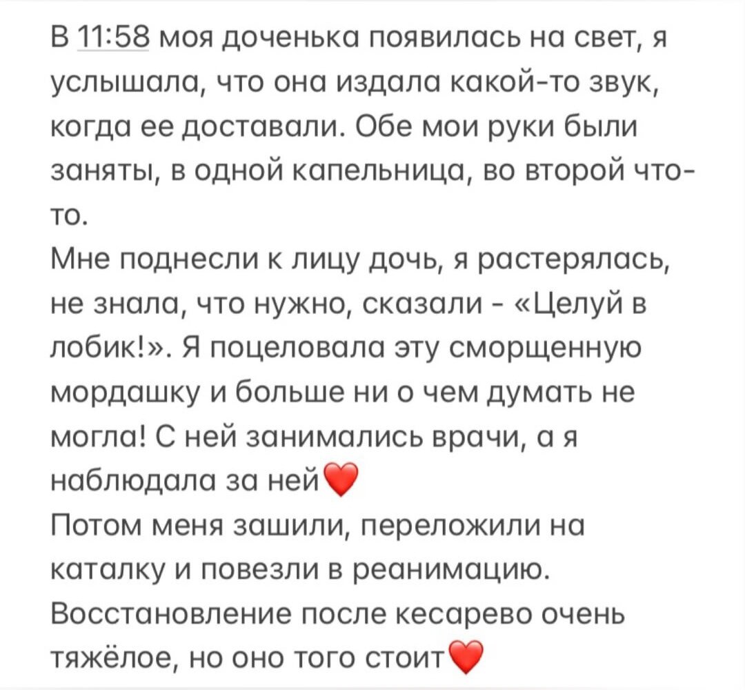Все бывает в первый раз. Мое первое кесарево сечение было по показаниям, как и второе. Много различных эмоций вызывают эти воспоминания. С самого начала беременности я знала, что у меня будет КС. Относилась я к этому с позитивом, всем говорила, что это очень удобно - р*зрезали, в*тащили, зашили! И мучиться не надо😁... Легла я в роддом заранее, чтобы врачи успели взять все анализы и хорошо подготовить меня к операции. В роддоме было хорошо - общение, обмен опытом, ну, и просто спокойно, так как я была под наблюдением врачей и не надо переживать - «а вдруг сейчас начнется». И вот настал день операции. Я была спокойна и очень долго ждала своей очереди на операцию. Не понимала, зачем меня разбудили в 5 утра, подготовили и перемотали ноги эластичными бинтами туго-туго, так как ждать пришлось до 11:30. Я даже в какой-то момент не смогла уже лежать с этими бинтами на ногах и сняла их, потом снова их надевала. И вот за мной пришла акушерка, я взяла вещи, которые понадобятся в реанимации, и