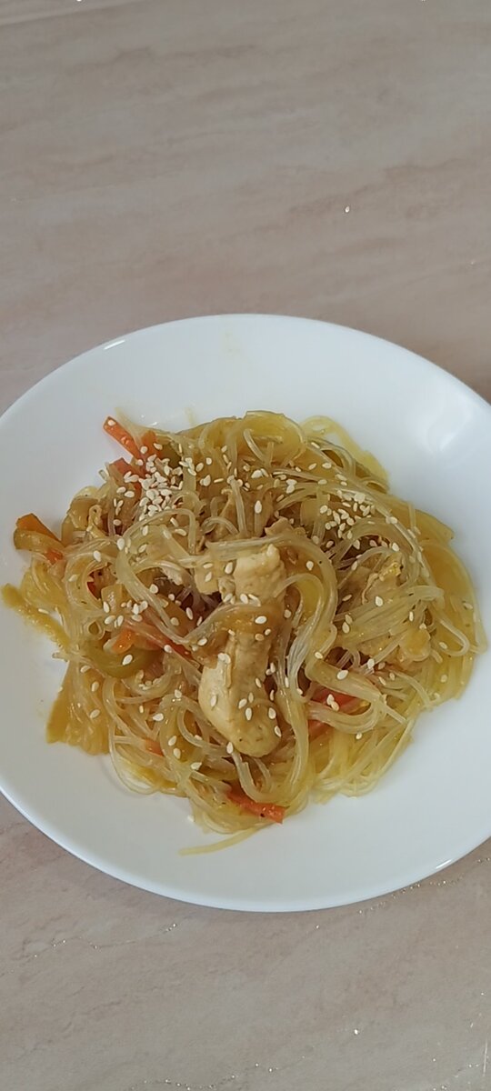 Когда хочется чего-нибудь вкусного, а времени на готовку тратить не охото, всегда готовлю фунчозу, поэтому пару пачек всегда имею в запасе) Ингредиенты: Приготовление Овощи и грудку нарезаем полосками Овощи тушим в следующей последовательности: лук, морковь, кабачки, помидор. По вкусу добавляем соевый соус и специи ( я люблю добавлять хмели-сунели) Овощи тушим почти до полной готовности. Перекладываем их в тарелку. В той же сковороде, где и тушились овощи обжариваем курицу. Добавляем соевый соус и ещё немного тушим. Пока обжаривается курица заливаем кипятком фунчозу и даём постоять 5-7 минут. Далее сливаем воду и промываем фунчозу холодной водой. Добавляем к курице тушёные овощи и хорошо перемешиваем. Добавляем мелко нарезанный чеснок. Тушим ещё пару минут. К курице с овощами добавляем фунчозу и всё перемешиваем. Посыпаем по желанию кунжутом и можно наслаждаться)