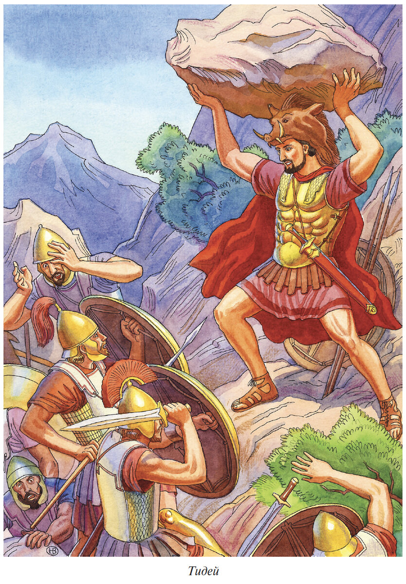 Тидей, не теряя времени, устремился к каменистой насыпи на краю обрыва, той самой, усевшись на которой, Сфинкс когда-то загадывал свои загадки. Тидей схватил там с земли огромный камень, поднял его обеими руками и швырнул прямо в толпу наседающих на него врагов. Насыпь была крутой и неудобной для нападающих, камень тяжёлый, поэтому вся толпа откатилась назад. Несколько раненых осталось лежать у подножия. Тидей, как молния, ринулся вниз, быстро поразил мечом нескольких растерявшихся врагов и затем так же быстро взобрался обратно, на вершину каменистого гребня.