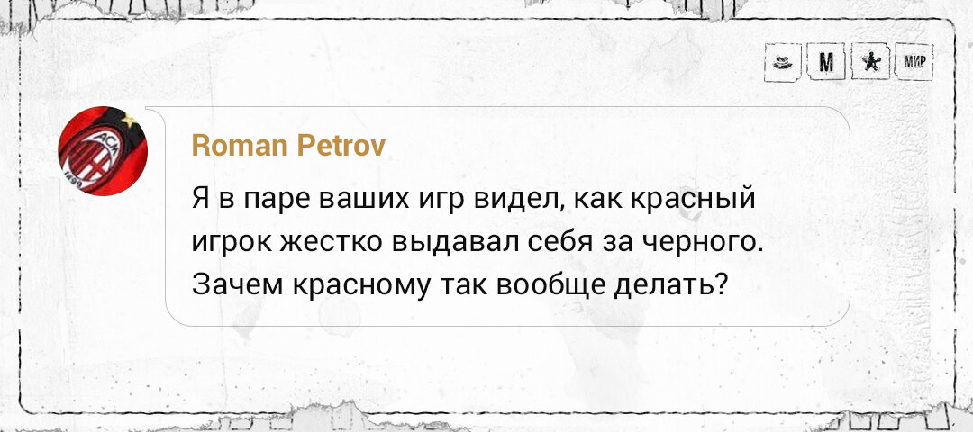 Зачем красные иногда выдают себя за черных❓ На самом деле, отличный вопрос. Дело в том, что такое действие в некоторых ситуациях может привести к появлению нового аргумента. 🤔 Пример Допустим, что вскрылось два шерифа. Настоящему шерифу никто не верит и игра складывается так, что он уходит на голосовании при 9-х. В такой ситуации игрок может рискнуть и сделать ход: сдаться черным и назначить отстрел в черного игрока. Главное сделать это максимально серьезно и уверенно, чтобы никто не подумал, что это шутка. И если на следующий день отстрелят кого-то в стороне, а не куда «назначил» сдавшийся шериф, то появится аргумент, что он, вероятно, был настоящим шерифом. Аргумент состоит в том, что если версию сдавшегося шерифа никто не играл и он назначил отстрел на «настоящего шерифа», то у черных вряд ли есть мотивация стрелять не туда, куда назначен отстрел. Плюс нужно успеть как-то переназначить между собой отстрел, что быстро сделать крайне сложно. Не факт, что после подобных дейс
