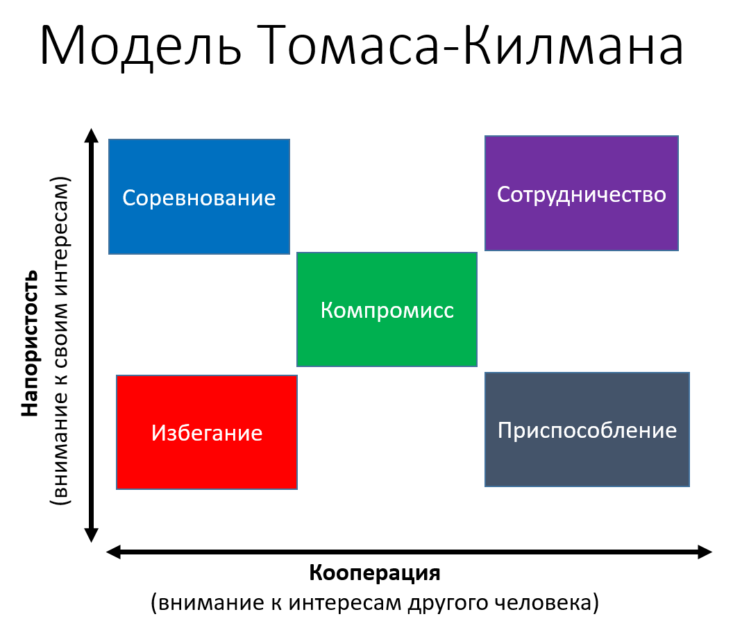 Для конструктивного решения конфликтов, важно знать о различных способах поведения в конфликте и уметь выбрать такой способ поведения, который в наибольшей степени соответствует данной ситуации. Как правило, человек в конфликтной ситуации ведет себя единственным, привычным для него способом, и не догадывается о существовании других способов поведения. Психолог К. Томас классифицировал все способы поведения в конфликте по двум критериям: стремление человека отстаивать собственные интересы (напористость) и стремление человека учитывать интересы другого человека (кооперация). На основании этих критериев К. Томас выделил пять основных способов поведения в конфликтной ситуации. Для удобства их можно представить и в виде образов животных: I Соревнов