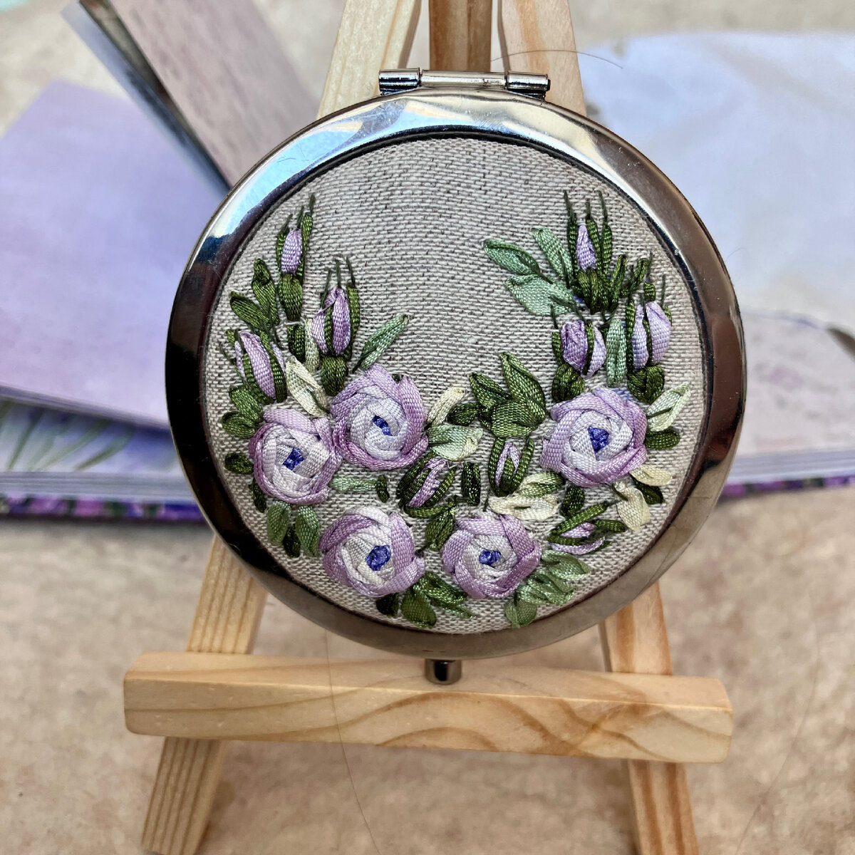 У меня так всегда: купить все материли и года два ждать чтобы попробовать. Так и с зеркальцем: основа лежала года два, потом я искала основу для самой вышивки из металла, на которую натянуть вышивку. Все нашла и не знала, что вышить. Формат для меня новый: больше чем брошь, но меньше чем кошелёк. Так что я очень нерешительная. Мне надо созреть. Хотя со стороны кажется: что такого?