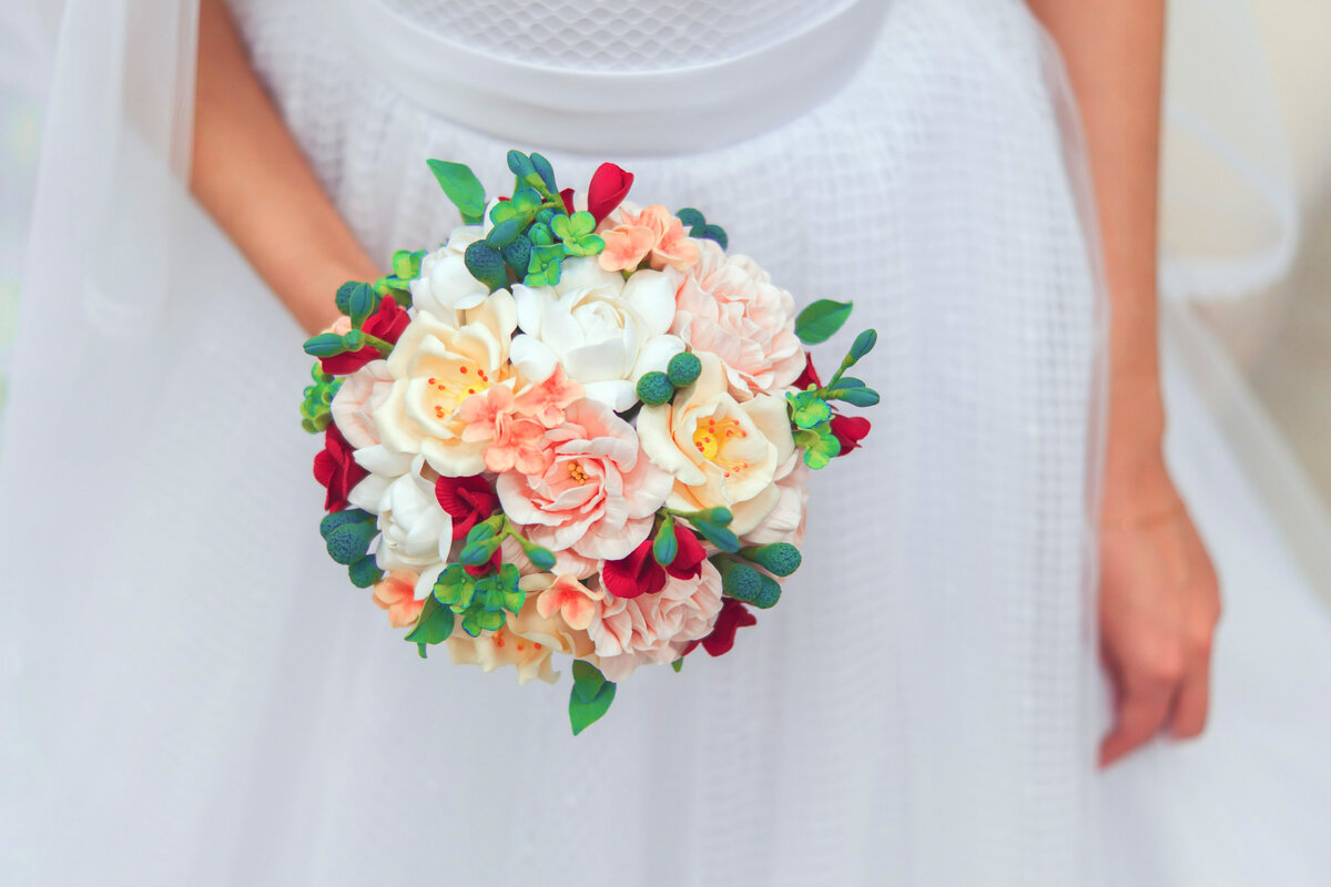 Максимально реалистичный. Автор:Речиц Светлана ***** Свадебный букет "Нежность". Свадебный букет невесты в персиковом цвете. Полностью ручная работа!!! Никогда не завянет и будет "радовать глаз" на протяжении долгого времени после свадьбы...Смотрится шикарно!!! Автор:Антипова Мария ***** Букет невесты из полимерной глины. Это 100% ручная работа. Каждый лепесток цветочка слеплен вручную и по уникальной технологии собран в единый цветок.