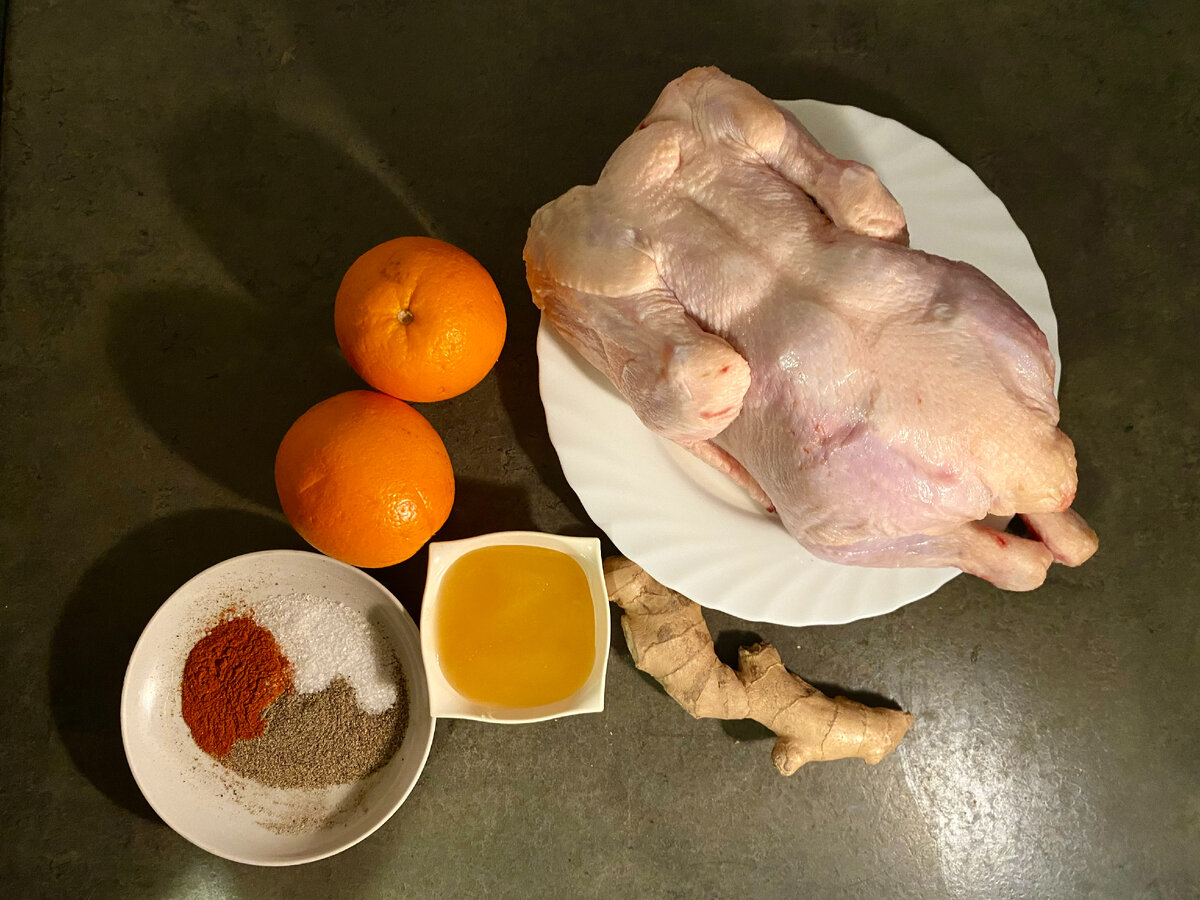 Время приготовления приблизительно 2-2.5 часа. 1) Один апельсин разделить пополам, одну половинку убрать остальные 2.5 апельсина очистить от кожуры и пленок, убрать косточки. Очищенные апельсины нарезать тонкими кружочками. Нарезанные кружочки выкладываем на противень и заранее разогреваем духовку до 200 градусов. 2) Курицу хорошо помыть и просушить, с помощью бумажных полотенец. Курицу обтереть маслом, солью и специями, лучше всего сделать это руками. 3) В противень с апельсинами, кладем нашу курочку в специях, грудкой вниз. Ставим в духовку на 40 минут (ставим таймер что бы не забыть). 4) Делаем заправку для курицы: Из половины апельсина выжимаем сок, в отдельную глубокую тарелку, потом из миски убираем все косточки и пленки, долен остаться только сок. 5) Имбирь очищаем, и трем на мелкой терке. Смешиваем апельсиновый сок, тертый имбирь, мед и можно добавить немного специй (я добавил немного черного перца). 6) Достаем курицу из духовки, по истечению 40 минут. В первую очередь, кур