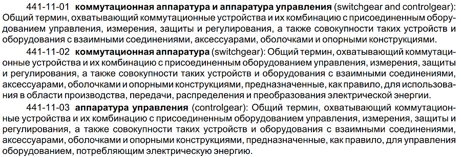 В ГОСТ IEC 60050-441–2015 «Международный электротехнический словарь. Часть 441. Аппаратура коммутационная, аппаратура управления и плавкие предохранители», который введён в действие с 1 июля 2016 г., определены термины: