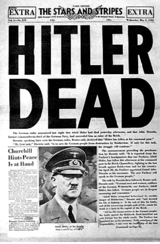 Адольф Гитлер совершил самоубийство между 15:26 и 15:30 в понедельник, 30 апреля 1945 года, застрелившись из личного пистолета Walther PPK в своём фюрербункере в Берлине (примерно в это же время Красная армия взяла под контроль первый этаж Рейхстага и находилась всего в 700—750 метрах от рейхсканцелярии и 450—500 метрах от фюрербункера)[1][2][3]. Его жена, Ева Браун, также совершила самоубийство, приняв цианистый калий[4]. В тот же день, в соответствии с ранее оставленной инструкцией Гитлера, их тела вынесли по лестнице через запасный выход бункера в сад, уложили в воронку, облили горючим и подожгли.