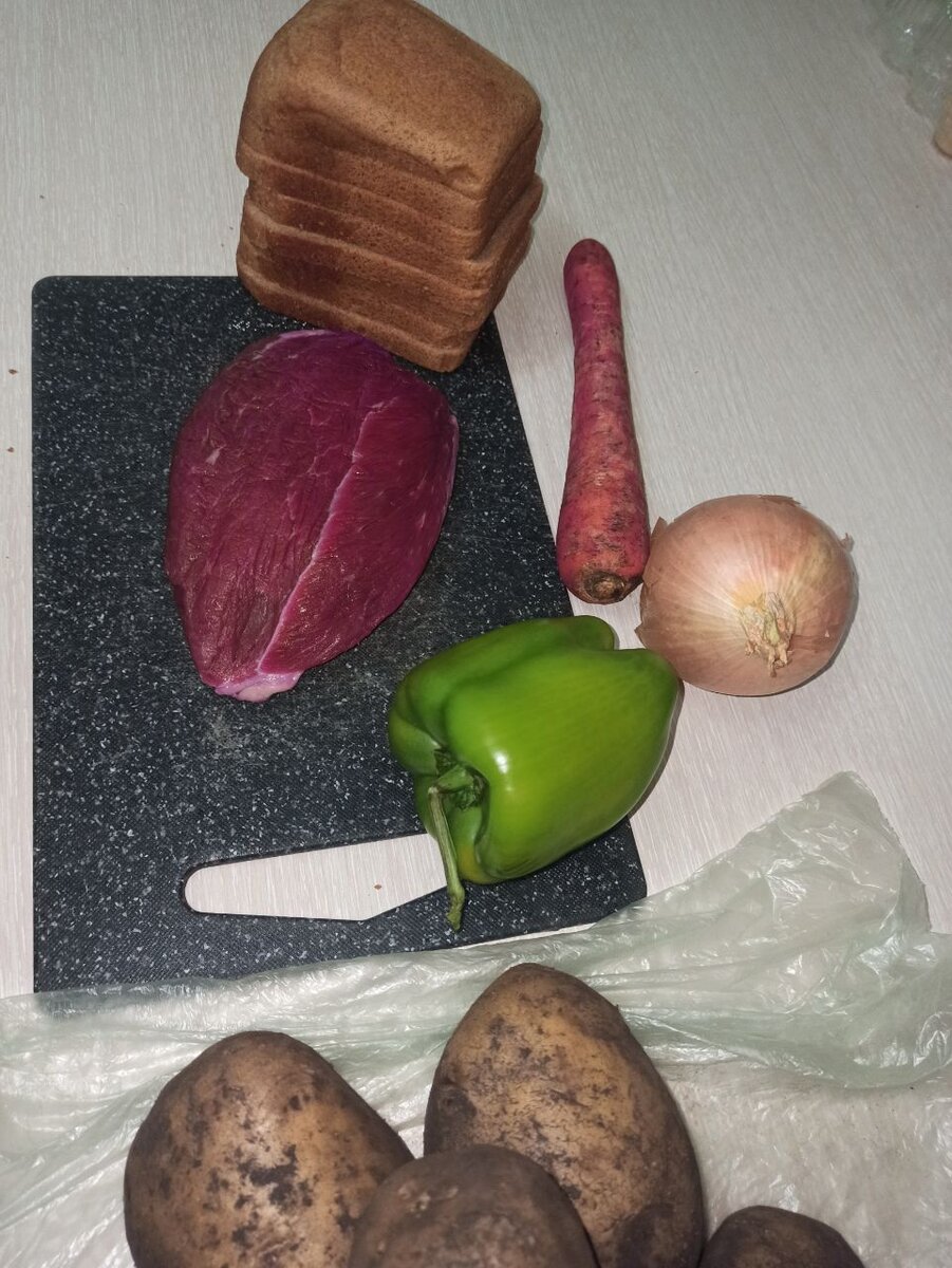 Приобрели по акции говядину, а именно голяшку. Т.к. новый год уже прошел и холодцы все наварили - будем делать гуляш, а загущать его хлебом ржаным. Нам понадобятся следующие ингредиенты : а именно : Мясо нарезаем небольшими кубиками (т.к. у меня голяшка - я сделал ее чуть поменьше, чтоб уж не совсем долго тушилась) как на фото: Отправляем его жариться в глубокую емкость (кастрюля, сотейник или же глубокая сковорода), обжариваем его до небольшой корочки солим-перчим, добавляем пару листов лаврушки, закрываем крышкой и оставляем тушиться минут на 40-45. В это время займемся овощами и корнеплодами : Лук и морковь чистим, нарезаем кубиками и отправляем жариться в сковороду, как лук немного подрумянится - те же операции проделываем с болгарским перцем : После того, как обжарили их немного - можно отставить. Как мясо начало мягчать - добавляем наши овощи и нужное количество воды. Добавляем соль, перец, сахар. Т.к. перец в магазине был только зеленого цвета - может получиться бледный гуляш,