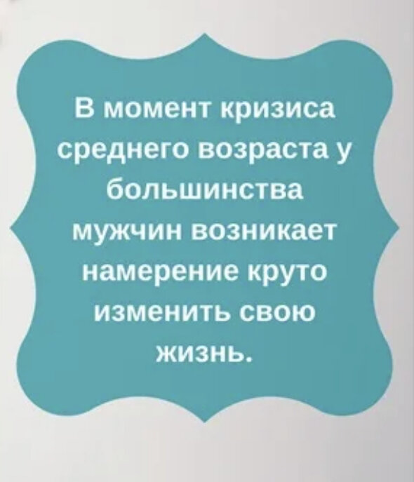Что такое кризис среднего возраста? Существует он в реальности или нет? Кто-то говорит, что это вновь обретенная вторая молодость, когда ты думаешь, что все ещё впереди и можно меняться и менять свою жизнь кардинально, если прожитая не устраивает. А кто-то говорит, что это психоэмоциональный сбой, когда человек не может объективно оценивать свои действия и поступки, следом разрушая жизни близких людей. Так что же такое кризис? Это новые эмоции, внезапно вспыхнувшая страсть, «любовь», когда надоел быт и бубнящая несчастная жена? Или это попытка все наладить и начать с чистого листа, если ты уже облажался и не смог вытянуть? Здесь важно реально взглянуть на себя и перестать строить воздушные замки! Все новое не поможет вытащить из себя закопанные проблемы, от себя не убежишь. Если не получилось, поговори сам с собой и найди в себе смелость признаться, что дело в тебе и менять надо только себя! Сними с глаз шторы и взгляни внутрь, а тело скажет правду от которой ты давно бежал!