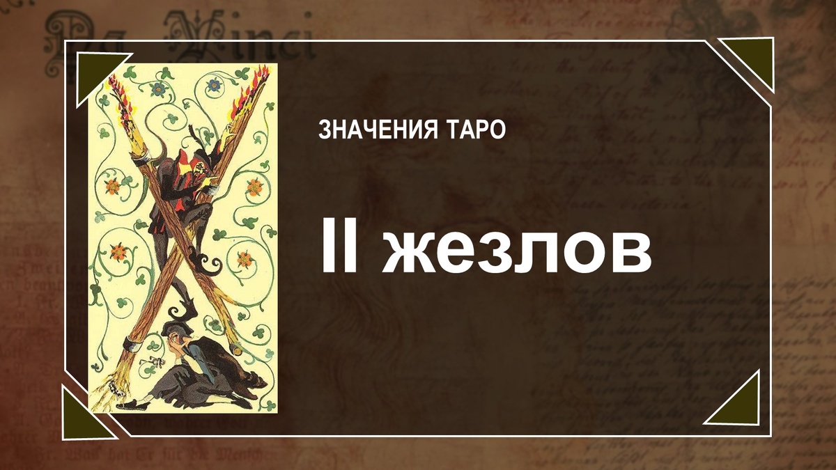«И хочется, и колется» Двойка – это привычное для огня положение. Интерес, интрига, желание уже зародились в душе. Сейчас жезлы решают, как лучше поступить. На самом деле, решение уже принято. Осталось только определить, за что схватиться в первую очередь. В общем-то, и об этом нет нужды размышлять слишком долго. «Дорогу осилит идущий», значит, сперва нужно начать действовать – а дальше будь, что будет. Двойка жезлов – это последний момент перед началом активных действий. Человек, подчиняясь своей амбиции, готовится вступить в бой. Он уже решился на этот шаг и теперь только подбирает наилучший способ. Энергия сконцентрирована в его руках. Он мобилизует доступные ресурсы, проверяет экипировку, в последний раз прочитывает план и готовится выступать. Как и всякая Двойка, эта карта – в какой-то степени даёт выбор. В данном случае выбор звучит как «быть или не быть». Двойка жезлов – это последний шанс передумать. Тройка спустит курок и отстрелит обратный путь. Сейчас нужно быть как никогд
