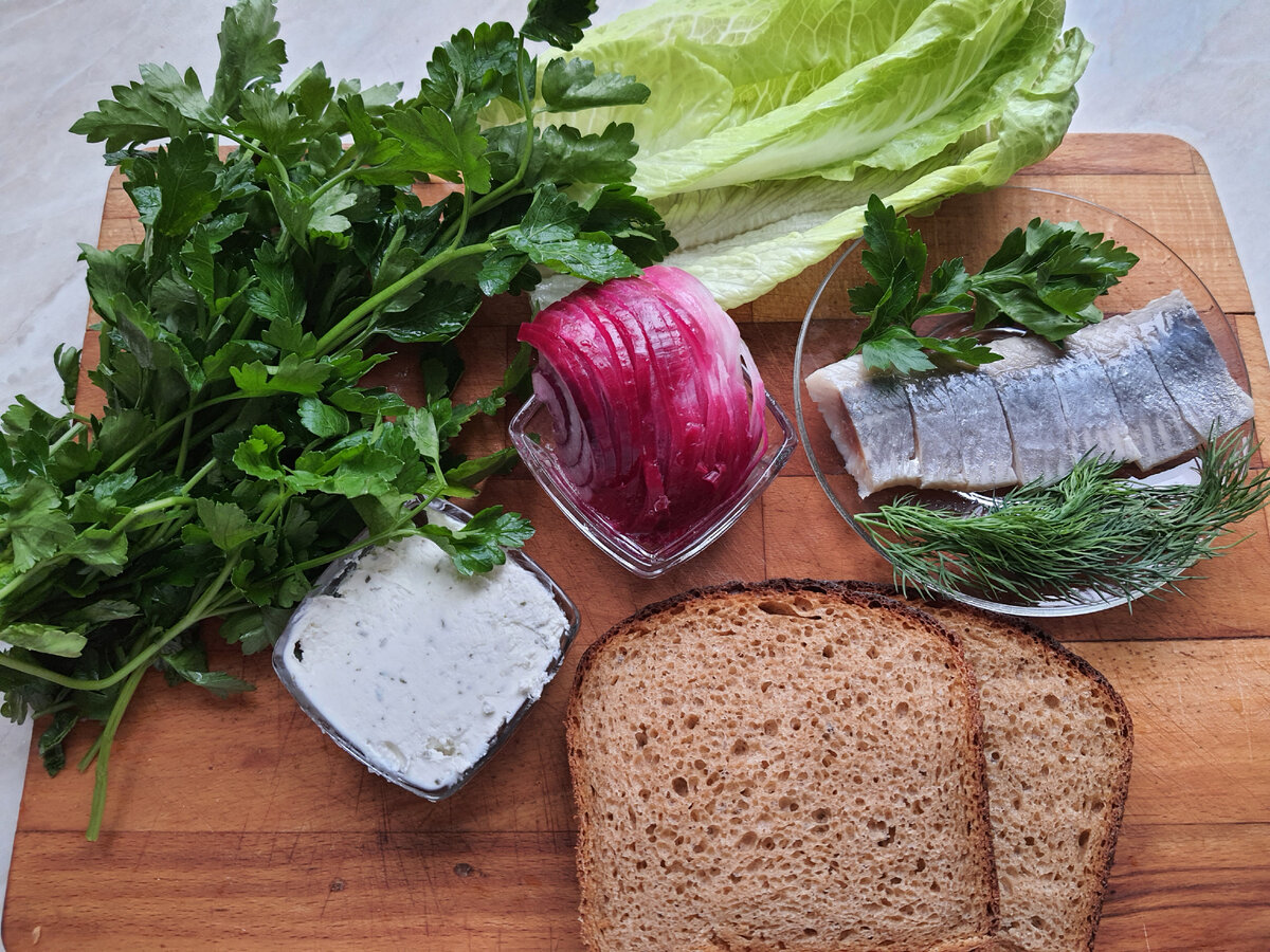 Хлеб, селёдка, маринованный сладкий лук, зелень, творожный сыр ( в рецепте Кулинарии на Красном Пути майонез) и листок салата ( в рецепте Кулинарии на Красном Пути отсутствует).
