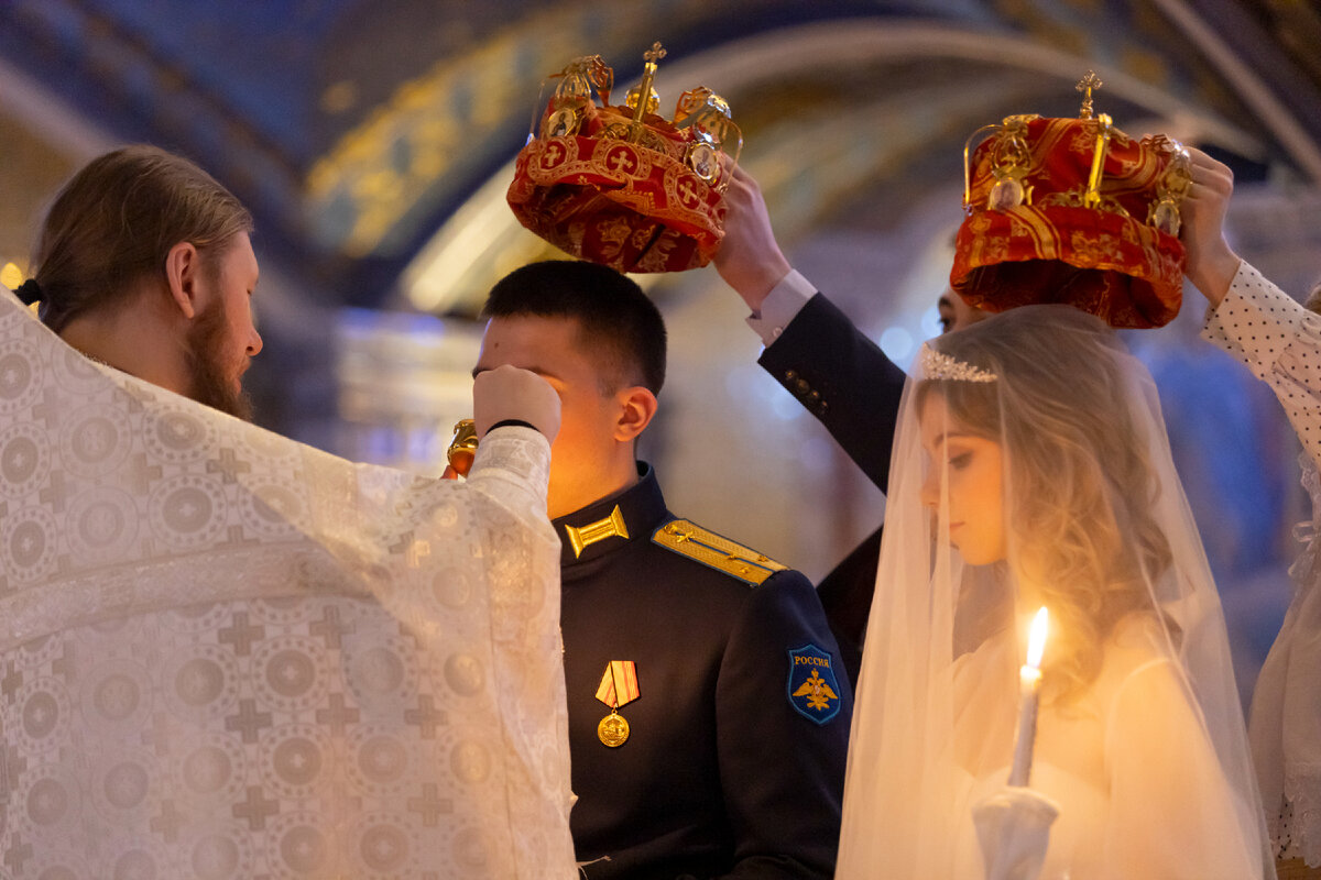 Расписались молодожены 18 февраля в Кутузовском дворце бракосочетания. И ни у кого не было сомнений, где именно следует скрепить свой брак перед лицом Господа. Даша и Саша обвенчались в Главном храме Вооруженных Сил России 19 февраля. Супруги пообещали хранить верность друг другу и быть единым целым. Таинство венчания возглавил иерей Игорь Иванов.
