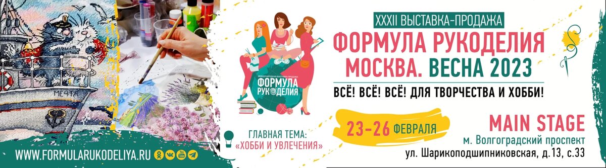 Подробный репортаж с выставки «Формула рукоделия. Весна 2023" "Формула рукоделия. Весна 2023" будет проходить в Москве 23-26 февраля 2023 года в концертно-выставочном зале Main Stage (ул. Шарикоподшипниковская, д. 13, с. 33). Даты проведения и часы работы: Место проведения: Концертно-выставочный зал Main Stage Адрес: ул. Шарикоподшипниковская, д. 13, с. 33 (пешком от метро Волгоградский проспект, Дубровcкая или Угрешская 9-14 минут) Участники Скачать план павильона Обратите внимание, что ярмарка-выставка размещается на двух этажах! Фирмы, выпускающие наборы для вышивки Станки Издательства Свободные дизайнеры, всё для рукоделия Авторские экспозиции на 2 этаже Билеты Вход платный: если покупать онлайн - 300 руб (льготный - 200 руб); билеты в кассе: на 1 день с 23 февраля по 25 февраля – 350 рублей; на 1 день 26 февраля — 300 рублей Если кто соберется на выставку, советую покупать билет в день выставки. Удобнее всего покупать билеты онлайн на сайте "Формулы рукоделия". Если купите биле