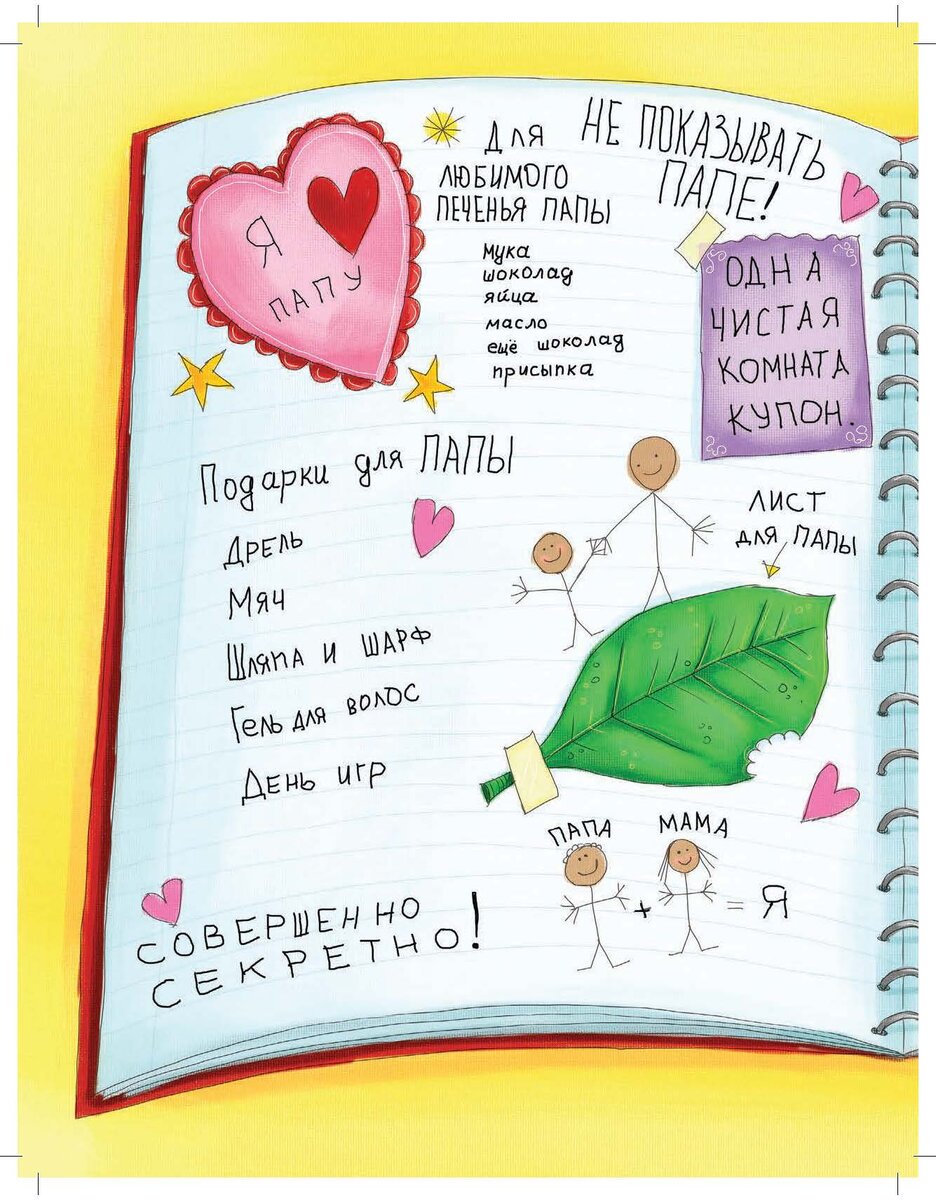 А вот и не обязательно усаживать детей за стол, приговаривая, надо приготовить папе подарок. В детях и так – как будто от природы – таится волшебная пружина, которая только и ждет, как бы вырваться с радостным возгласом: СЮРПРИЗ! Ведь дети обожают тайно готовить неожиданные радости нам, взрослым. То рисунки, то поделки, то концертики. Вам знакомо это? Сначала таинственное переглядывание, перешептывание, потом дверь закрывается – никому нельзя входить! – ну а потом… Потом вы только глаза распахиваете от радостного удивления – надо же до чего додумались. Сами. Именно эту звонкую струну детства и затронули в своей книге КАК УДИВИТЬ ПАПУ Джин Рейган и Ли Уайлдиш, превратив ее ни больше ни меньше в руководство для детей КАК приготовить подарок своими руками. Но в отличие от книг поделок, которых достаточно много и сейчас, да и всегда было, в книге КАК УДИВИТЬ ПАПУ акцент сделан не на «технологии» изготовления, а на процессе, или проекте. Слова эти, конечно же, не звучат в детской книге –