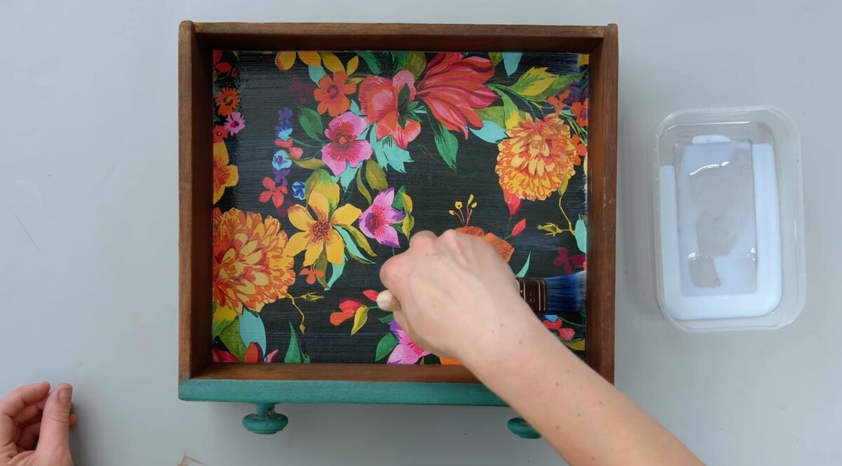 На дно положите вырезанную деталь обоев и чистой кистью, начиная с центра и двигаясь к краям, аккуратно прижмите обои к дну ящика. Оставьте работу до тех пор, пока клей не высохнет.