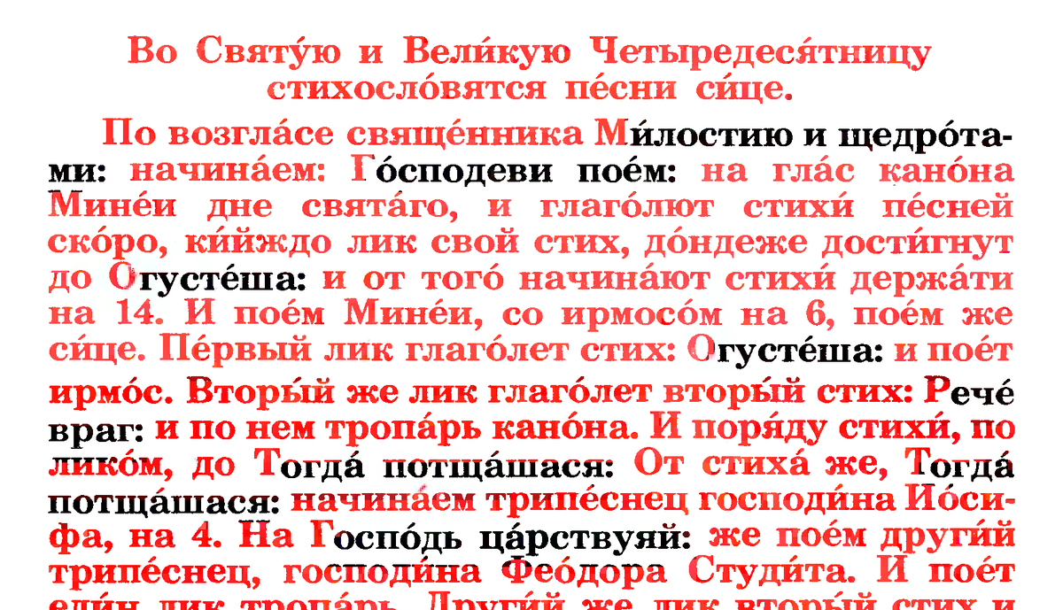 Как видно, в чтении канона принимают участие три источника: ирмологий (стихи песней), триодь (трипеснцы господина Иосифа и господина Феодора) и минея (канон дне святаго).