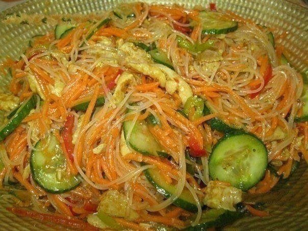 Ингредиенты: ● 3 моркови натерла на терке, ● 1 красный, 1 зеленый перец нарезала соломкой, ● 3 огурца нарезала тонкими кольцами, ● 200гр куриного мяса (соломкой), обжарила с приправой карри, ● 100гр фунчозы приготовила по инструкции, Приготовление: Смешала все. Сверху в кучку насыпала приправы для корейской моркови, соль по вкусу,подсолнечное масло примерно чуть меньше пол стакана, раскалила и бросила туда 5зуб чеснока ( из чеснокодавки ), и сразу же вылила это масло с чесноком на кучку с приправой. Все тщательно перемешала и добавила уксус по вкусу (примерно 1-1,5 ст. л. л) Дать настоятся часок. Приятного аппетита!
