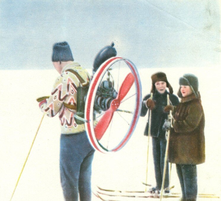 Мы привыкли к тому, что любое моторное средство транспорта должно иметь раму, на худой конец опорное устройство, где можно закрепить двигатель. Но вполне надежным опорным устройством могут быть и плечи человека. Ранцевый винтомоторный —аэродвижитель для лыжников, созданный в общественном конструкторском бюро Поволжского лесотехнического института — имени М. Горького (Йошкар-Ола) мастером спорта Ф. Магиным, именно этот вариант и предусматривает. Пропеллер за спиной дает возможность лыжнику двигаться по снегу со скоростью до 30 км/час. Движитель пригодится в перспективе не только для прогулок. Технические виды спорта рождаются на глазах. Вполне может появиться еще один — соревнования аэролыжников. Конструкция движителя очень проста, его легко сделать за несколько вечеров. Основная ее часть — бензиновый двухтактный двигатель воздушного охлаждения мощностью порядка 4—5 л. с. с числом оборотов ноленчатого вала в пределах 4000—5000 об/мин. Этим параметрам соответствует двигатель от бензопилы «Дружба», мотоблока или какой-либо другой воздушного охлаждения. Эти двигатели относительно легки, и плечи вполне их выдержат.