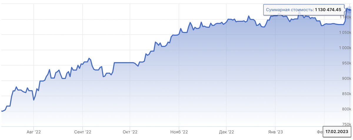 В конце каждой недели мы подводим промежуточные итоги и делимся результатами: 11 июля 2022 г. - 800 000 руб. 19 февраля 2023 г. - 1 130 474,45 руб. Доходность портфеля: +41,3% Индекс Московской биржи: -2,41% Российский фондовый рынок показал отрицательную динамику на этой неделе. Одна из причин — это внеплановое заседание Совфеда и Госдумы 22 февраля 2023 г., которое пройдёт после обращения президента РФ. Участники рынки перестраховываются в ожидании эскалации и продают акции. Дополнительное давление на рынки оказали новости о новых санкциях в отношении России. На неделе участники рынка закрывали длинные позиций, срабатывали стопы и маржин-колов у тех, кто поверил в рост и набирал позиции с плечами. Кроме этого, было давление со стороны шортистов. Мы тоже были на этой стороне. Заработали на шорте Русала. Котировки, дошли до целевого ориентира — 37,635 руб., где сработал take-profit. В результате чего, мы заработали за два торговых дня +33 913,04 руб. Кроме этого, мы открыли короткую по