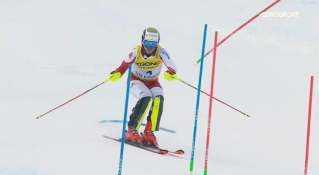 Тобиас Кастлунгер из Южного Тироля пробился в лучшую тридцатку с 40-м номером. Он хорошо начинает, везет 41 сотых, потом уже 71 сотую. И очень чисто проходит выкат – Тобиас привозит больше секунды бельгийцу и становится новым лидером. В начале этого сезона Кастлунгер уже удивил публику – 23-летний итальянец стартовал в шестом десятке, а в итоге занял десятое место в Валь д`Изере.