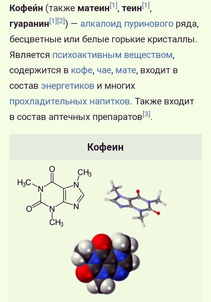 Все мы знаем что главное активное вещество, содержащееся в кофе называется кофеин. А что это вообще такое? Как он влияет на наши основные органы? Что такое кофеин Кофеин изначально содержится в растениях, из которых он потом переходит в напиток. Причем встречается он не только в кофе, а ещё и в чае и в других растениях. Причем в зависимости от «носителя» меняется его название: Кофейные зерна – кофеин. Чайные листья – танин. Мате – матеин. Южноамериканская лиана гуарана – гуаранин. Официальное систематическое название – алкалоид 1,3,7-триметил-1H-пурин-2,6(3H,7H)- дион. Выделенный в чистом виде кофеин – это белые прозрачные кристаллы без цвета и запаха. Изначально природа создала это вещество для защиты растений от патогенной микрофлоры. Для них оно является сильнейшим токсином. Кстати, Википедия указывает, что он высокотоксично и для нас. Это ещё раз напоминает нам о том, что во всем надо знать меру. Как действует кофеин Вещество имеет способность хорошо растворяться