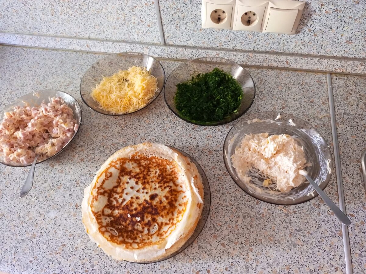 ✌ Укроп ✌ и конечно же, наши блинчики😍 Собираем первую начинку: ветчина+сыр+ майонез+чеснок