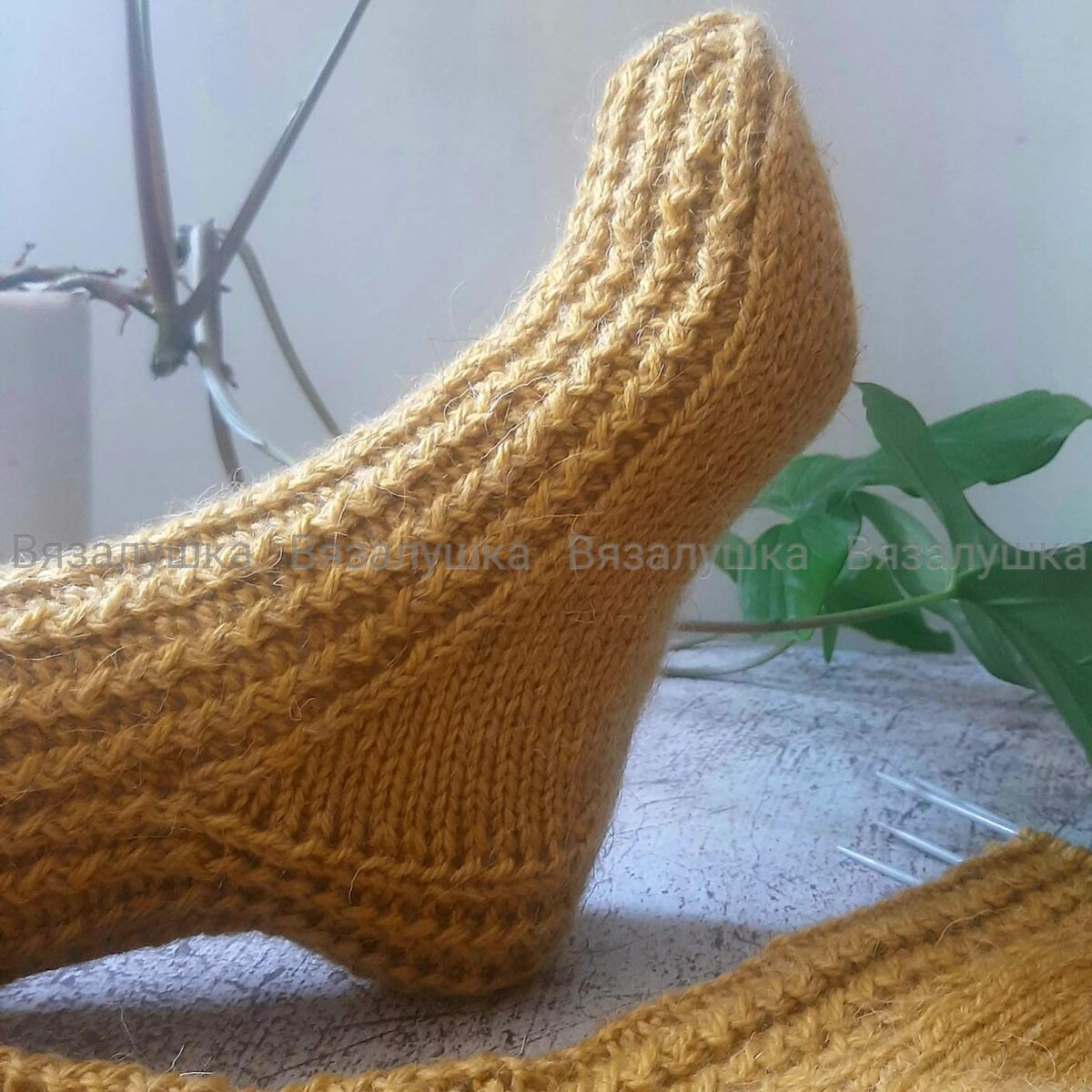 Я вязала 36 рядов, носки средней высоты. Но, как я говорила, пряжи одного мотка не хватило на мысок второго носка, хотя должно было хватить. Поэтому решайте сами, сколько рядов связать (можно 30-32). Если хотите высокий паголенок, то лучше иметь 2 мотка.