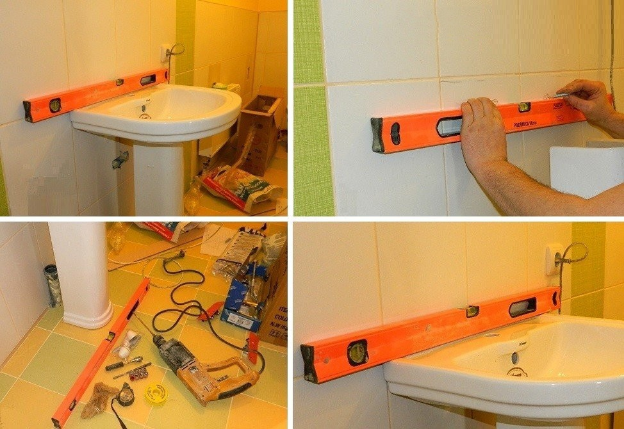 Обе метки соединяем линией, которая покажет высоту монтажа кронштейнов. После этого берем раковину и переворачиваем ее. Затем фиксируем на боковых стенках кронштейны. После этого прикладываем чашу к верхней горизонтальной отметке, прижимаем ее к стене. При этом следим, чтобы все ранее намеченные линии совпали. Вставляем маркер в отверстие, отмечаем места для установки креплений.