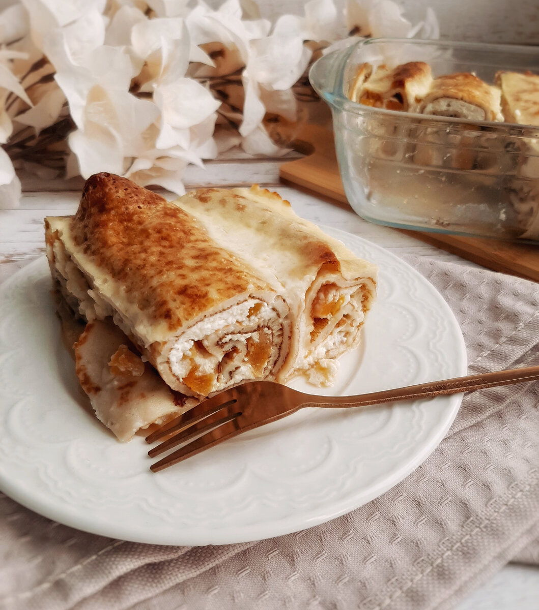 🍽КБЖУ на 100 г.: 177.3 ккал 12/9.2/11.6 Выход: 553 г. 🍽Ингредиенты: ▫️Для блинчиков: Яйцо куриное - 1 шт. Кефир 1% - 125 г. Мука рисовая - 30 г. Кукурузный крахмал - 10 г. Кипяток - 25 г. Ванилин - 1/2 ч.л. Сода - 1/3 ч.л. Ванилин - 1/2 ч.л. Подсластитель по вкусу. ▫️Для начинки: Курага - 30 г. Творог 5% - 180 г. Яйцо куриное - 1 шт. Ванилин - 1/2 ч.л. Подсластитель по вкусу. ▫️Для заливки: Яйцо куриное - 2 шт. Сметана 10% - 100 г. Подсластитель. 🍽Приготовление: 1️⃣ Курагу заливаем кипяточком и откладываем в сторону. 2️⃣ В 125 г. кефира добавляем треть чайной ложки соды и перемешиваем. 3️⃣ В отдельной миске яйцо перемешиваем венчиком с подсластителем и ванилином. 4️⃣ Вливаем кефир и снова перемешиваем. 5️⃣ Просеиваем 30 г. муки и добавляем к общей массе, перемешиваем. 6️⃣ Тонкой струйкой вливаем 25 г. кипятка и перемешиваем. 7️⃣ Добавляем 10 г. кукурузного крахмала и снова перемешиваем. 8️⃣ Жарим блинчики на хорошо разогретой и смазанной маслом сковороде. У меня получилось 4