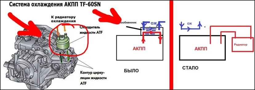 Далее в контур датчика и на сам радиатор., по верху выходит охлажденное и заходит в штатное место АКПП.