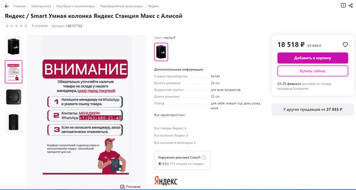 В общем, столкнулись с новой версии старого развода. Теперь через магазин WB. Не знаю, можно ли тут поместить ссылку на конкретный товар, но скрин вот. Собственно, умную колонку мы себе и искали. Цена, конечно, уже кричила о том, что это мошейники. Но любопытство оно такое. Ма написали по номеру телефона, указанного в объявлении. Далее, опять картинки: Фантазией, к сожалению, не обладаю, что дальше писать не придумала:) А вот что приходит на почту: Домен (по кнопке "Подвердить") свежий (по данным whoise от 4 февраля 2023). К Яндексу, естественно, никакого отношения не имеет. Сразу переадресовывает на другой домен, созданный в ноябре 2022 года. Там есть форма для заполнения адреса, и кнопка оплаты, которая ведет на третий домен, также созданый в феврале текущего года. Форму оплаты заполнять уже не стали. Надеюсь, что некто на том конце вотсапп не сильно расстроился. А, ну и сам телефон "менеджера" пробивается как "Мошейники из ВБ". В общем, друзья, не ведитесь, будьте бдительны! P.S. На